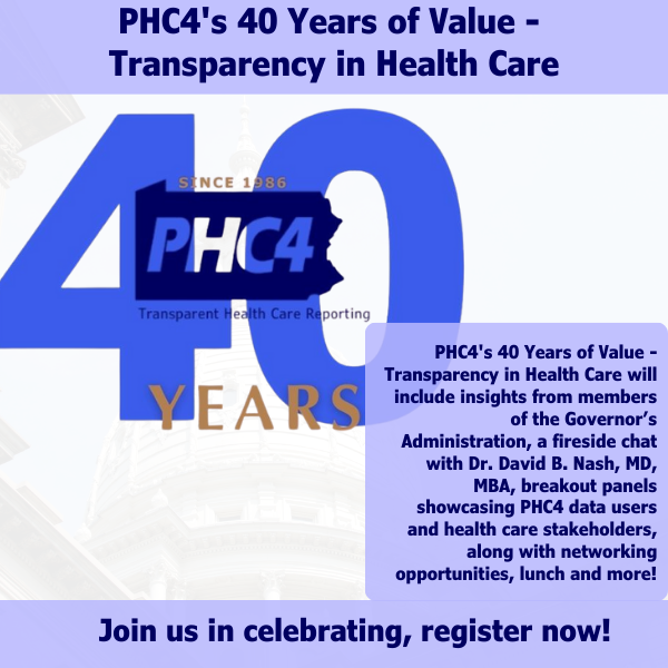 The Pennsylvania Health Care Cost Containment Council (PHC4) is pleased to invite you to join us as we recognize a major milestone of 40 years of independent, transparent, and impactful health care reporting in Pennsylvania.