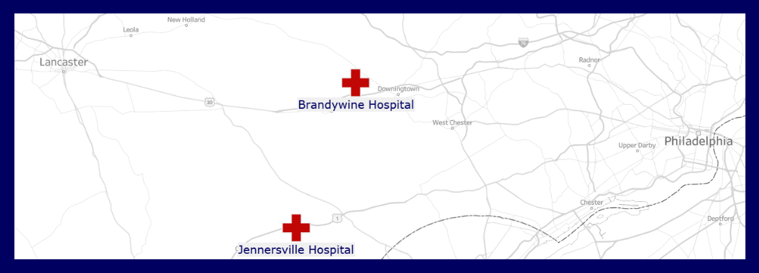 Among the hospital closures in PA were Brandywine Hospital (Brandywine) and Jennersville Hospital (Jennersville), both operated by Tower Health at the time of their closure. Jennersville was closed to patients on December 31, 2021, followed by Brandywine on January 31, 2022.² This article focuses on the closures of Brandywine and Jennersville as a case study to better understand the dynamic of recent hospital closures in the state. Both located in Chester County, the two hospitals were less than 20 miles apart from each other when they closed. The map below shows their locations in relation to each other and a few cities in Southeastern PA.